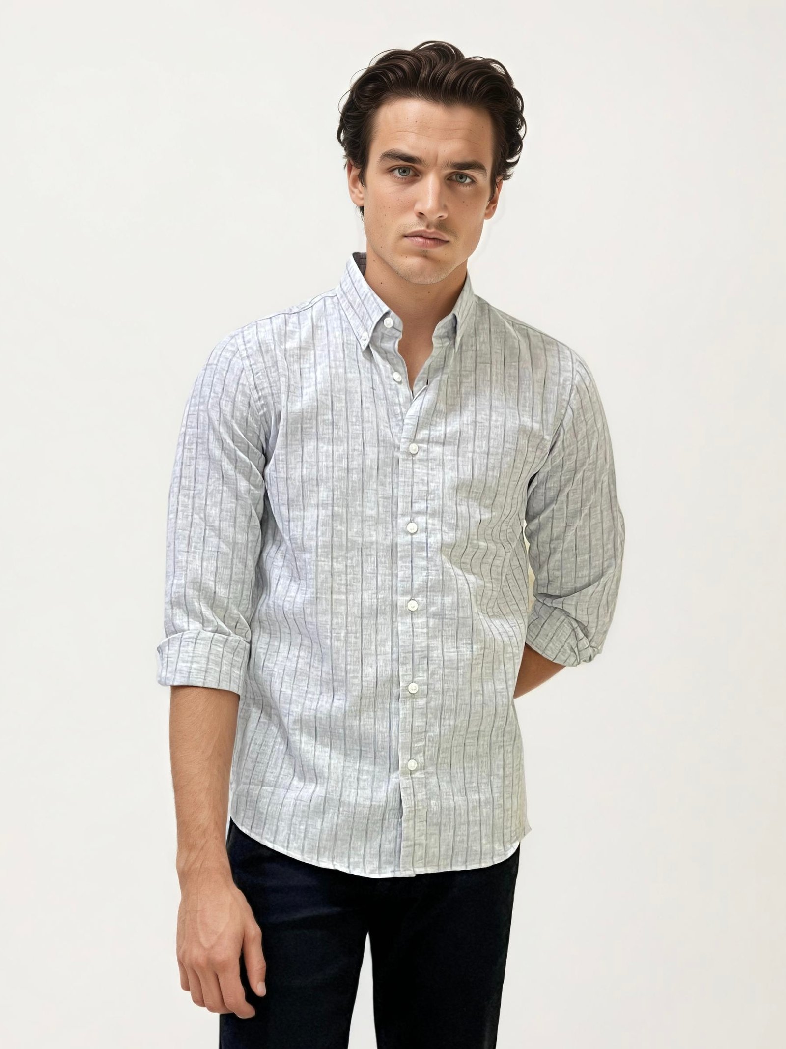 ₹999.00Add effortless elegance to your wardrobe with this full-hand mandarin collar linen striped shirt. Crafted from breathable linen and styled with vertical stripes, this shirt brings a relaxed yet refined look perfect for warm-weather days or casual evenings. The mandarin collar lends a modern, minimal edge, making it a go-to for understated sophistication. Key Features: • Lightweight linen fabric for…