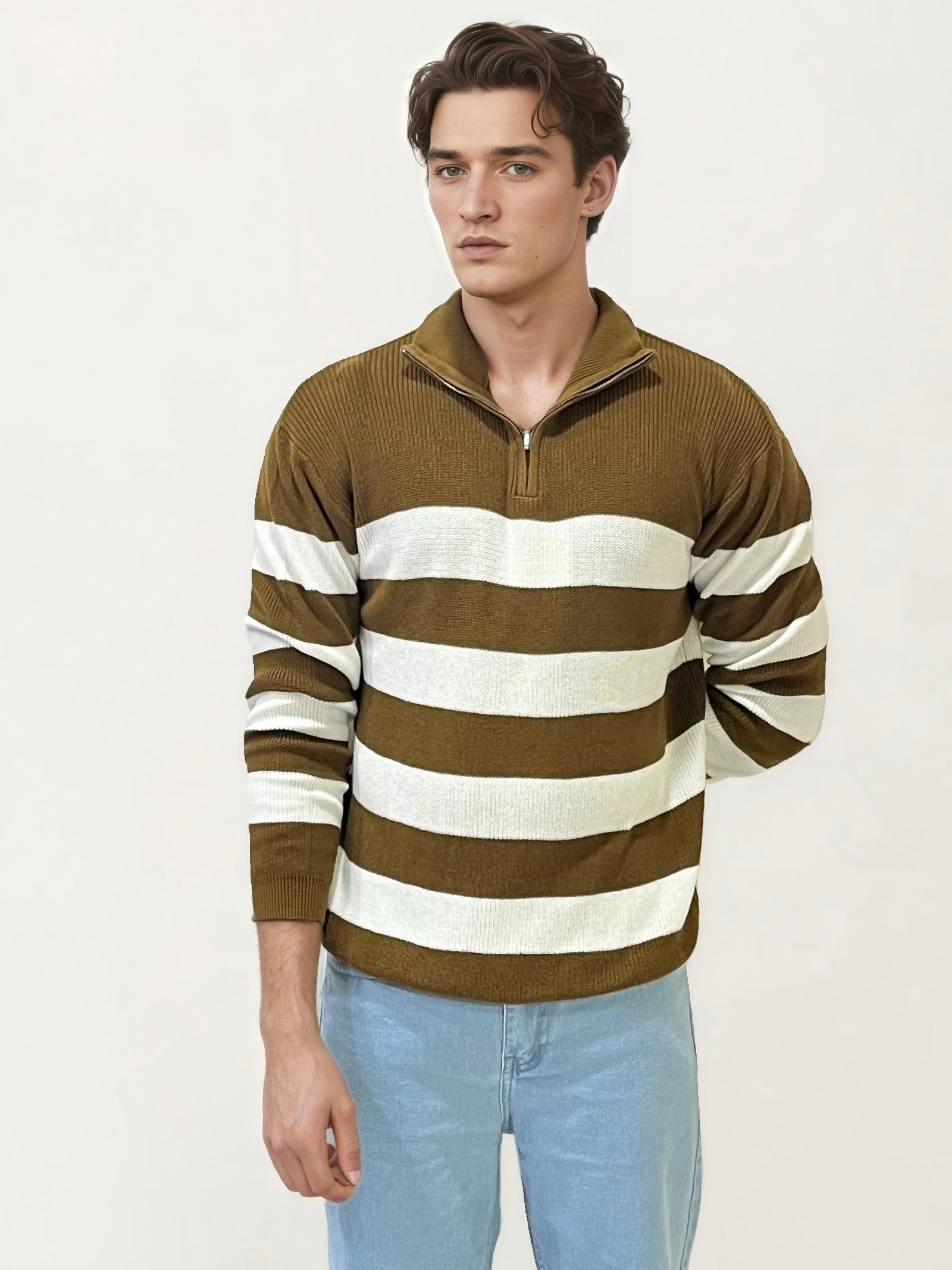 Brown-white Turtle Neck Fullhand Zipper T-Shirt