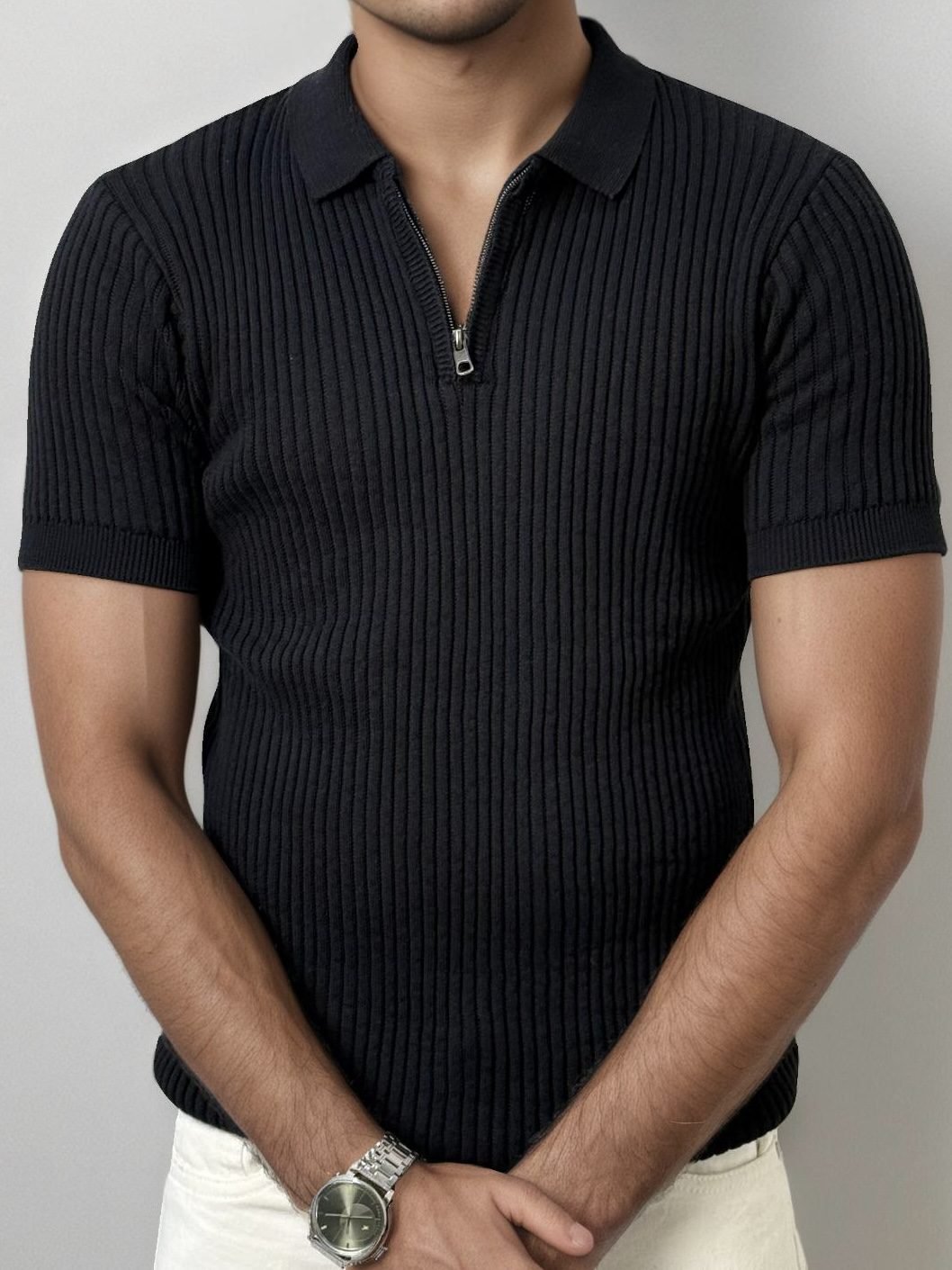 Black Half Zip Knitted Polo Shirt