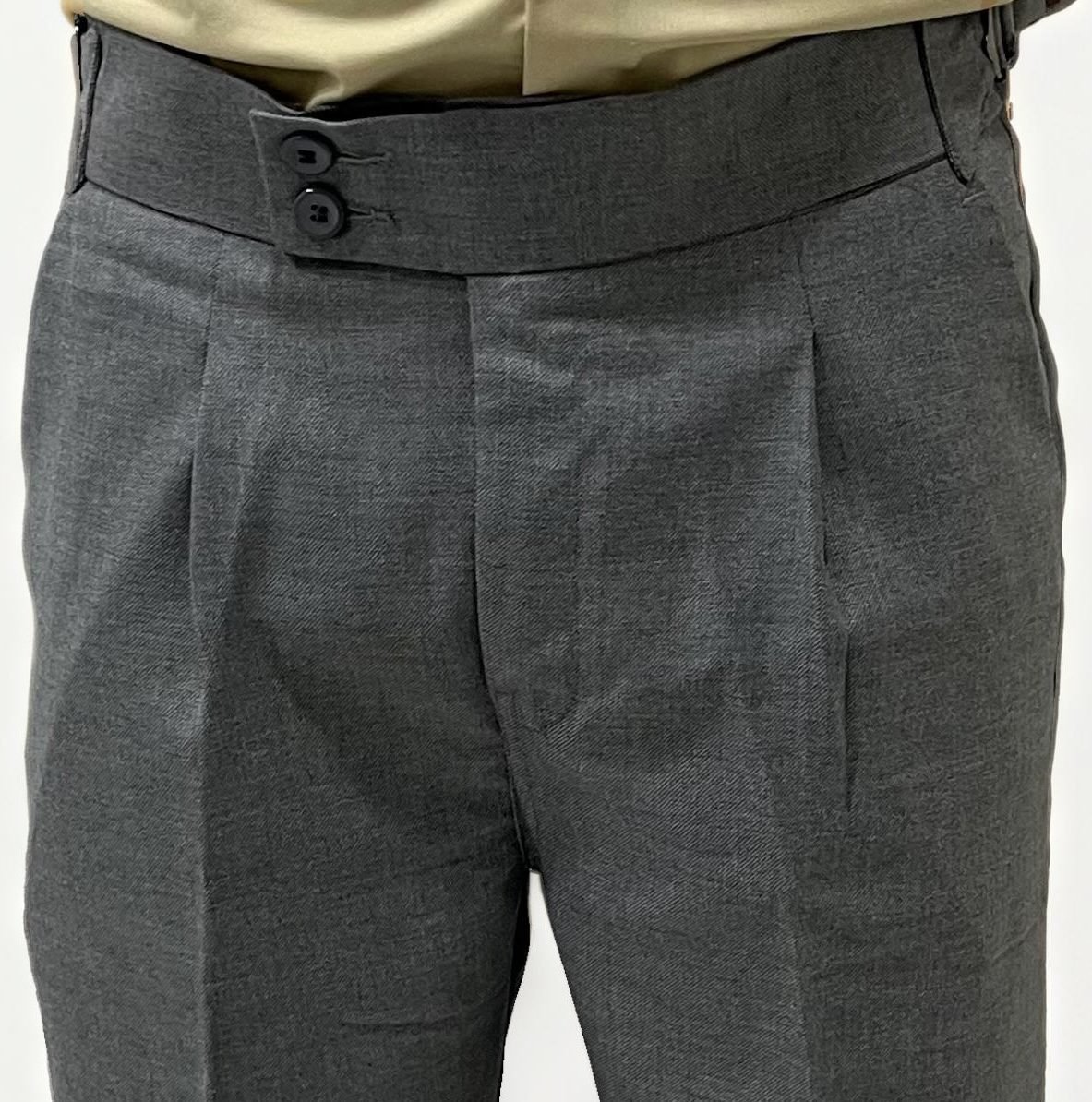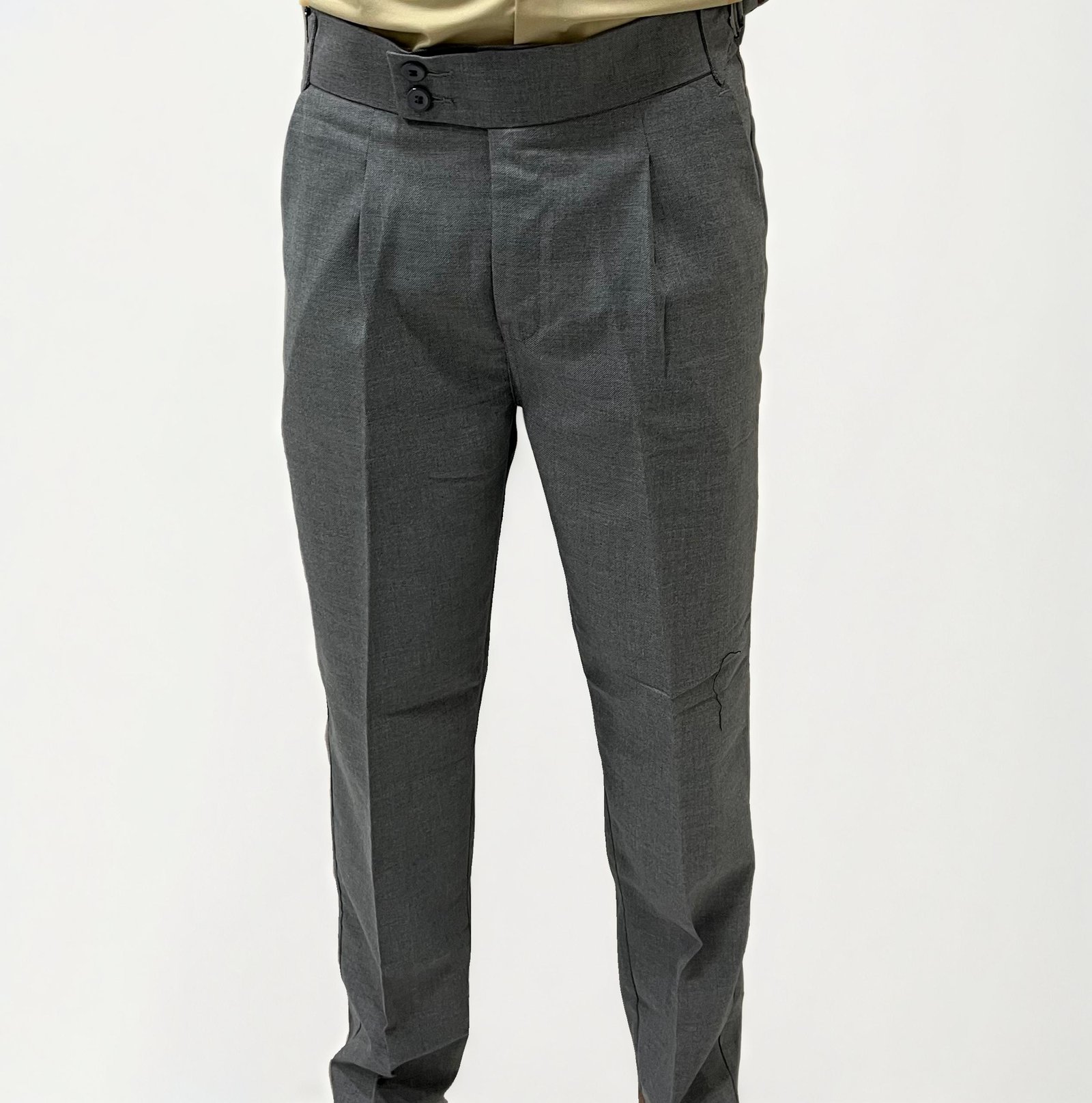Upgrade your formal wardrobe with these classic grey pleated trousers. Designed with a modern slim fit, these pants feature a refined double-button extended waistband and front pleats for a sophisticated yet comfortable look. The crisp center creases enhance the tailored silhouette, making them perfect for business meetings, formal events, or upscale daily wear. Crafted from smooth, breathable suiting fabric to ensure all-day comfort and elegance.
