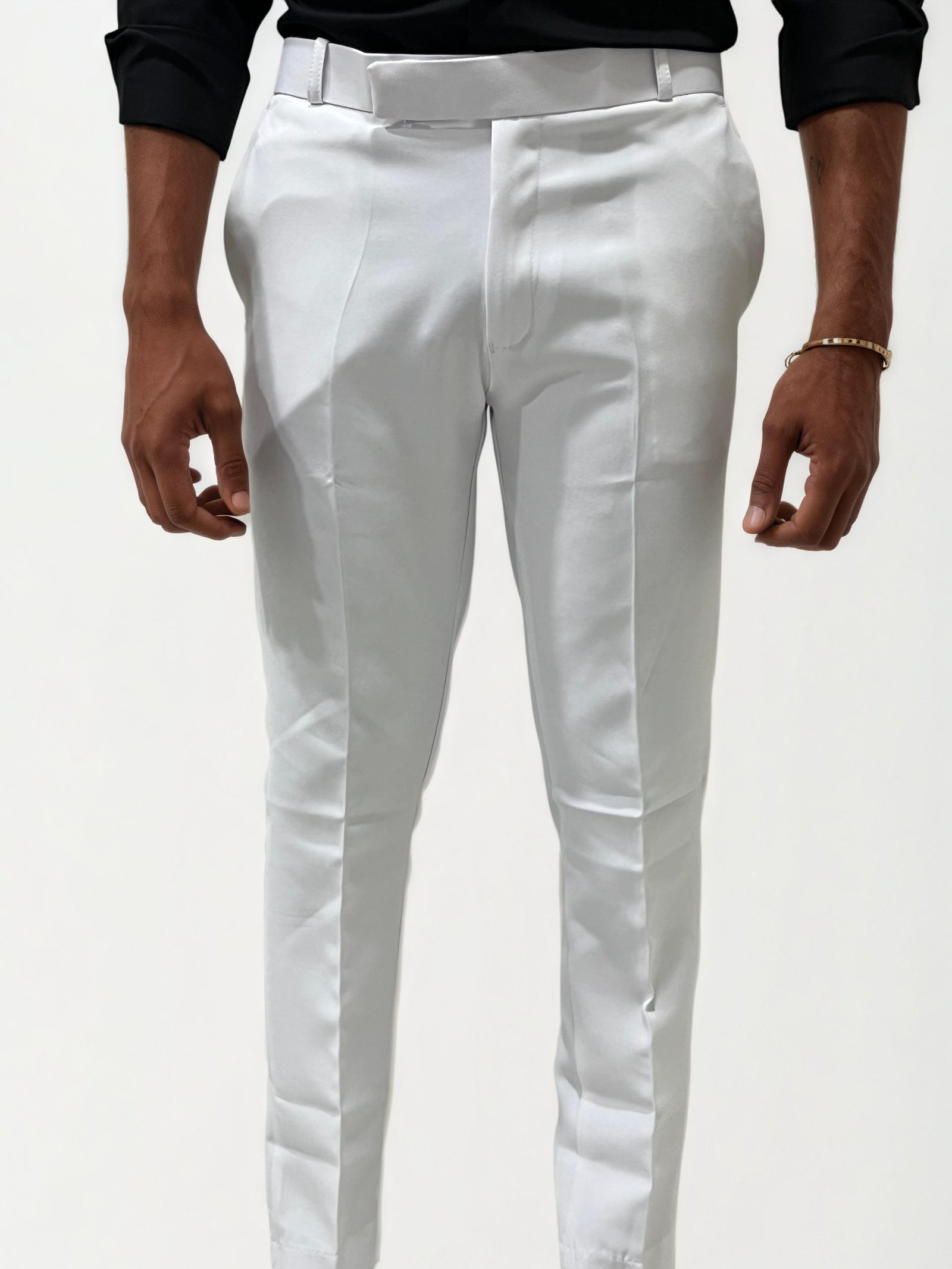 Upgrade your formal collection with these sleek white tailored trousers. Designed for a slim fit, these pants feature a clean flat-front design with sharp crease lines, giving a refined and modern silhouette. The extended waistband with concealed hook closure and wide belt loops enhances the structured look, making it ideal for sophisticated occasions or high-end events. Crafted from smooth, breathable fabric for all-day comfort and style.