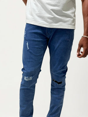 Elevate your casual style with these trendy distressed denim jeans. Crafted from durable cotton-blend fabric, these jeans feature a slim-fit silhouette that enhances your profile while providing all-day comfort. The stylish distressed detailing on the thighs and knees adds a bold, modern edge, making them perfect for off-duty looks. Finished in a classic mid-blue wash, these jeans pair effortlessly with a basic tee or hoodie for a laid-back, urban vibe.